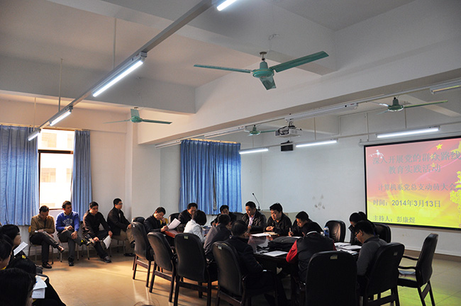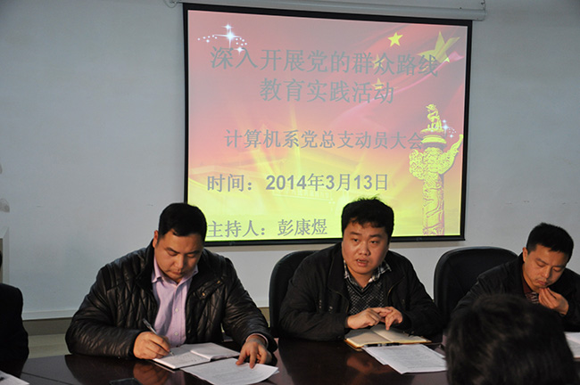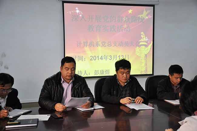 2014年3月13日,根据公司党委的统一部署与要求,计算机科学与技术系党总支召开了党的群众路线教育实践活动动员大会。会议由计算机系党总支书记彭康煜主持,计算机系全体教师参加,并邀请了党群工作部副部长陈朝阳同志到会指导。
