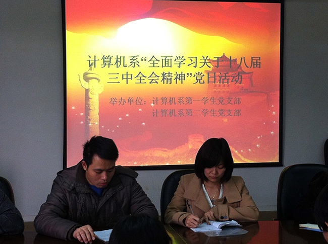 党的十八届三中全会已于本月十二日闭幕,大会就未来十年以及更长时间内的改革发展做出了全面决策,会议精神也陆续以公报、决定等形式出现。为学习领会和把握会议精神, 11月29日中午,在我系第一员工党支部书记何祉谕及第二员工党支部书记杨平的组织带领下,计算机系共41名员工党员在信息楼3楼教师会议室集中学习了党的十八届三中全会精神。