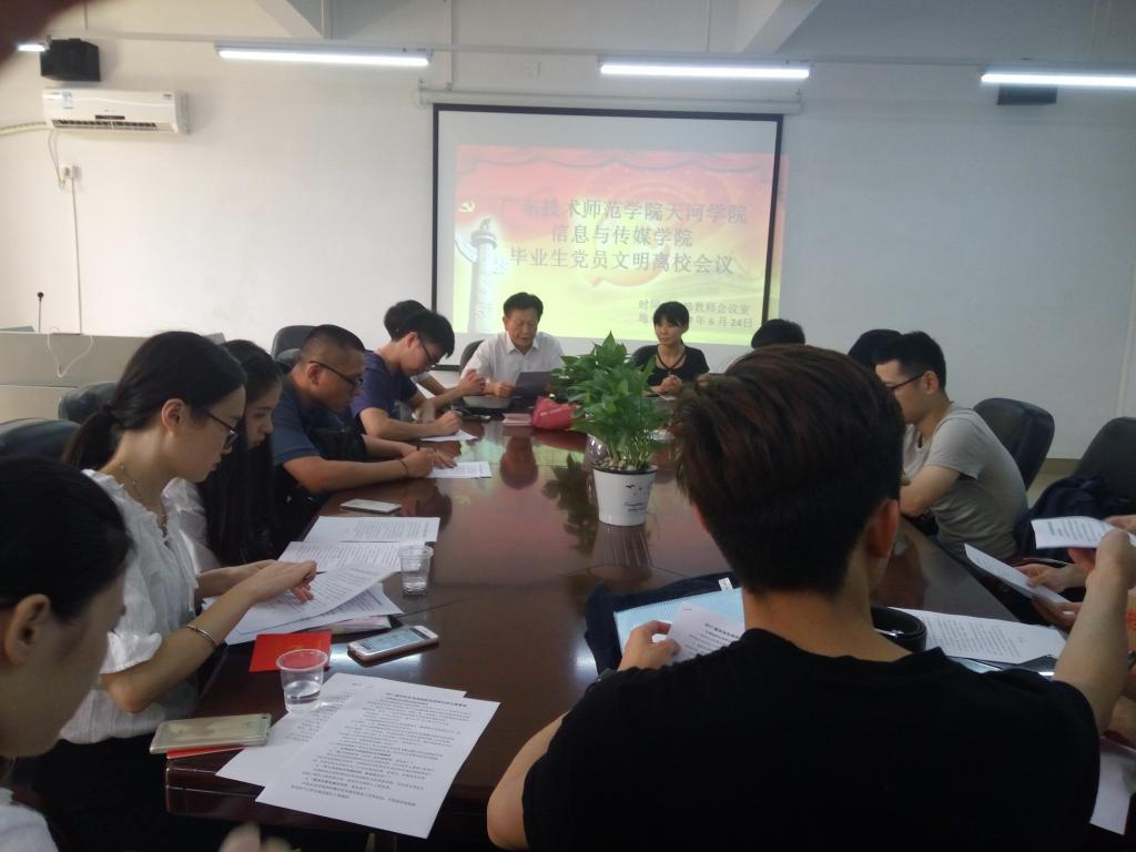 6月24日,公司在信息楼教师会议室召开信息与传媒毕业生党员离校会议,出席本次会议的有信媒党总支书记袁颂皎以及2017届全体毕业生党员。