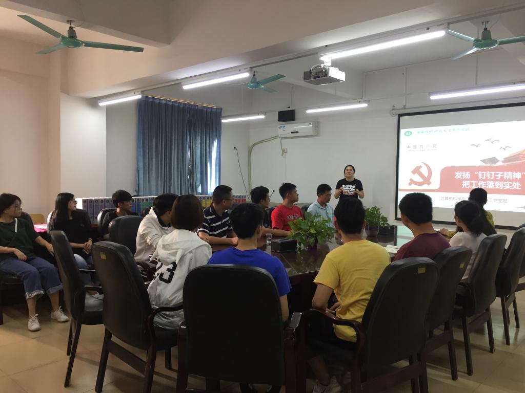 教工党支部副书记陈星莹从习近平总书记在《之江新语》专栏里发表的一篇名为《抓落实如敲钉子》的短文开始讲述,阐述了“钉钉子精神”的寓意:干事业好比钉钉子,钉钉子往往不是一锤子就能钉好的,而是要一锤一锤接着敲,才能把钉子钉实钉牢;钉牢一颗再钉下一颗,不断钉下去,必然大有成效。党的十八届三中全会更是将“发扬钉钉子精神”写入了《中共中央关于全面深化改革若干重大问题的决定》。