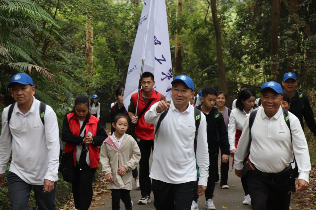 深秋时节的帽峰山空气清新、景色宜人。早上8点整,随着一声出发号令,胡社军董事长、黄圣诚书记等党政领导带领第一梯队率先出发,其他七个梯队紧跟其后。大家穿过穗丰村乡村小道,从小石船景区直入山道,一路领略帽峰山森林公园的云山、迷雾、密林、繁花,听山涧林泉潺潺,看飞鸟穿过云林,拍远处楼影幢幢,为同事好友鼓劲,在轻寒中向海拔534.9米的主峰进发。