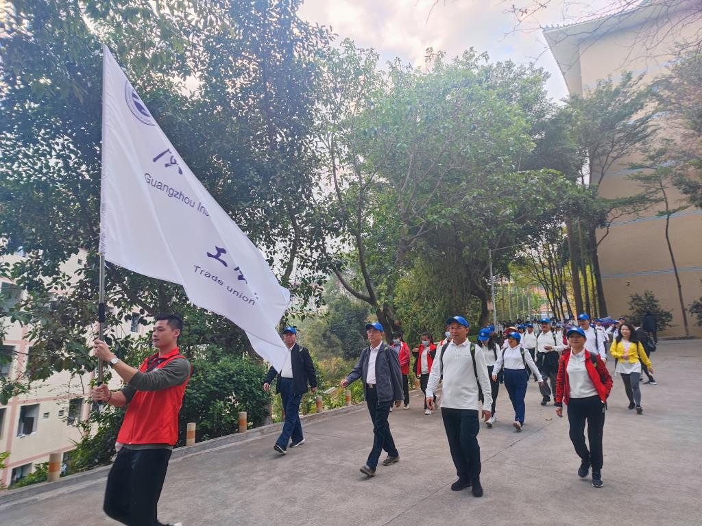 大家一边感受沿途美景,一边交流学期工作,一边品读东江纵队的历史,共话新时代美好生活。大家步履轻快,头顶蓝天白云,脚下一路黄叶,不知不觉间2个多小时已经过去,终于成功登顶。整个登山队伍中,年龄最小的3岁、最大的68岁,上下20公里的徒步,无一人掉队,展现出了广州理工人良好的精神风貌。