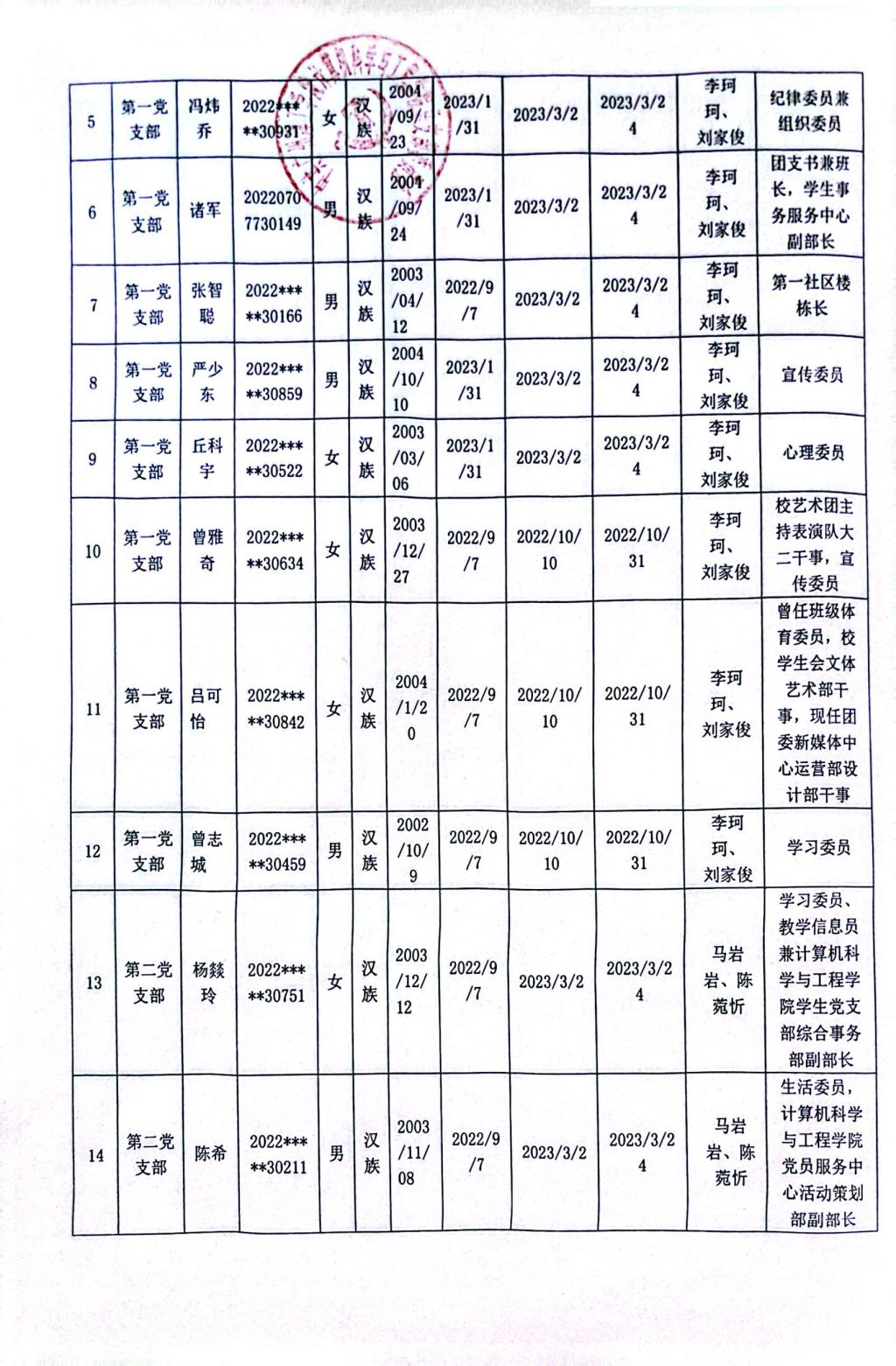 (通讯员:阳可人)在听取培养联系人、党员和群众意见的基础上,经支部大会、支委会研究决定,拟确定李美琳等50名同志为发展对象,具体情况公示如下。