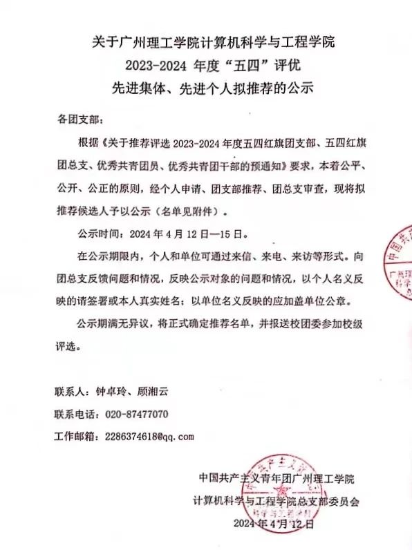 伟德国际1946亚洲版关于2023-2024年度“五四”评优先进集体、先进个人拟推荐的公示
