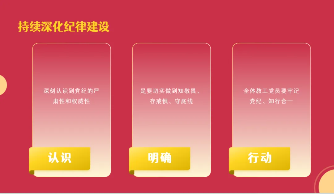 结合公司和公司工作实际,她指出,党纪是党的各级组织和全体党员必须遵守的行为规范。随后,全体教工党员围绕增强党纪学习教育展开研讨。大家纷纷表示要切实增强纪律意识,时刻绷紧纪律这根弦,做到心有所畏、言有所戒、行有所止。同时,多位教师党员同时也兼任员工党支部的组织管理工作,将严格按照公司党委要求开展相关学习实践活动,带领各自分管的员工支部把党纪与校风学风建设结合起来,为保证公司高质量发展提供坚实的纪律保障。