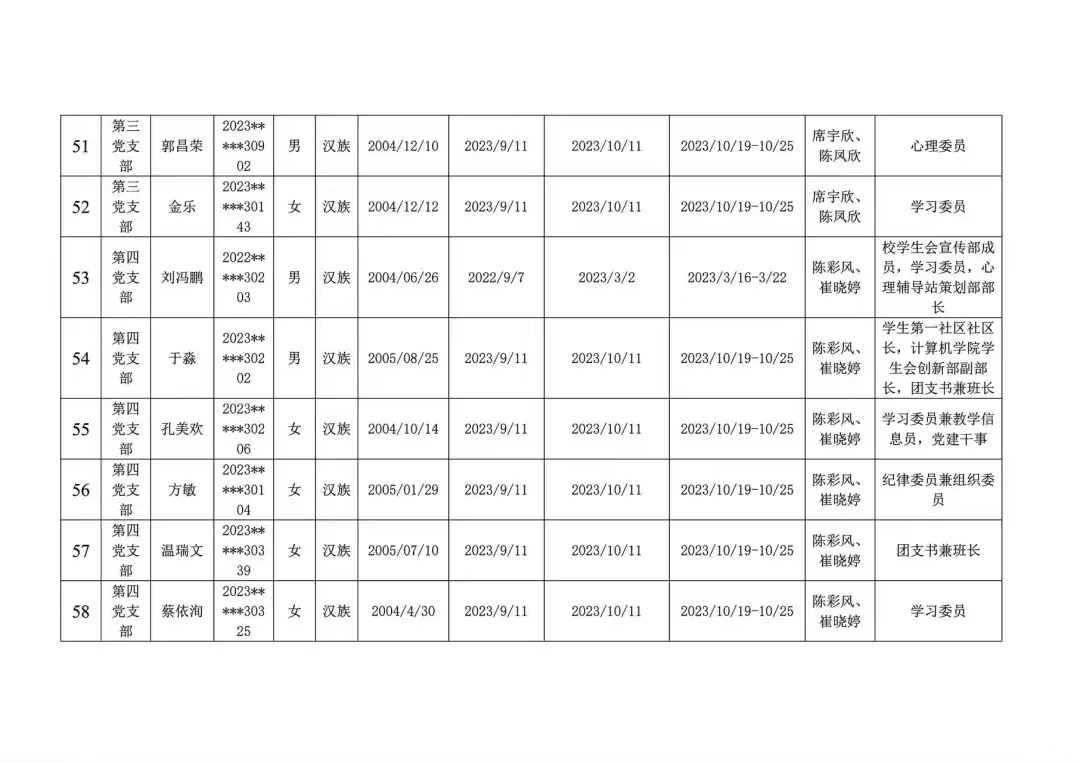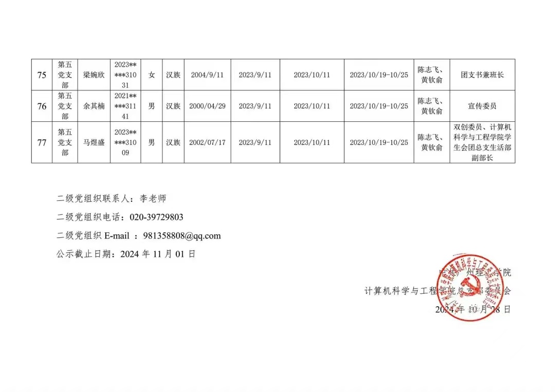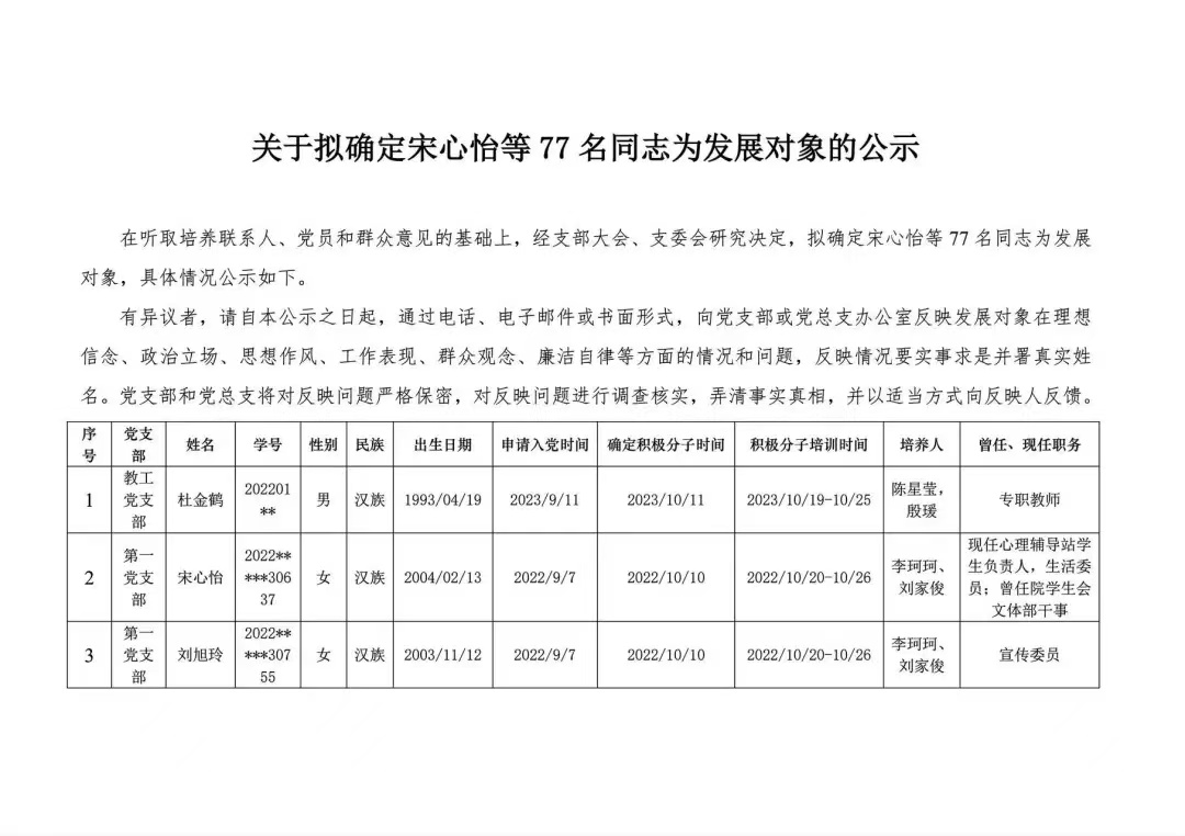 在听取培养联系人、党员和群众意见的基础上,经支部大会、支委会研究决定,拟定宋心怡等77名同志为发展对象,具体情况公示如下。