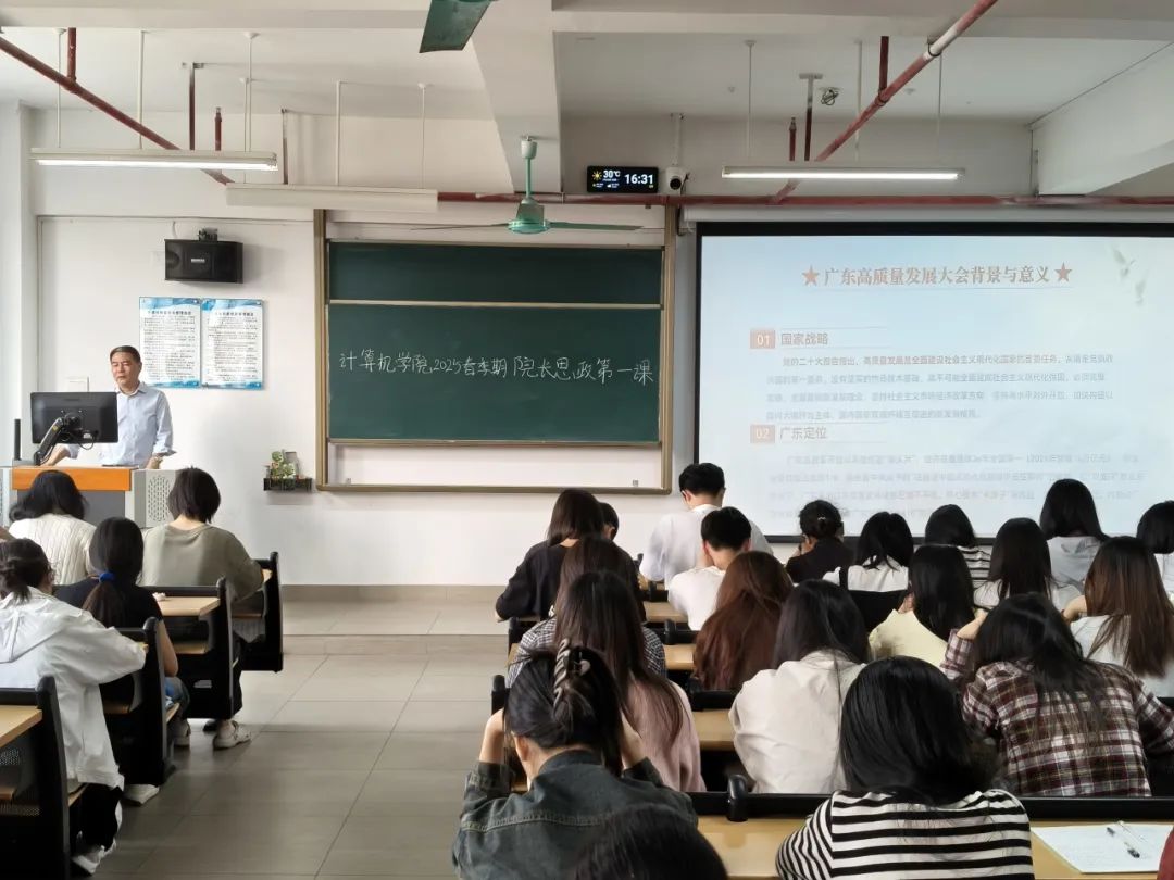 石经理以“学习广东高质量发展大会精神,勇担新时代青年使命”为题,从“广东高质量发展召开的背景与意义”、“广东高质量发展实践”和“青年学子在高质量发展中的使命与担当”三个方面,带领同学们了解了广东高质量发展大会精神。石玉强经理强调,高质量发展是全面建设社会主义现代化国家的首要任务。发展是党执政兴国的第一要务。没有坚实的物质技术基础,就不可能全面建成社会主义现代化强国。自改革开放以来,广东始终走在前列,面对如今大时代变革,发展势能更是不容小觑,传统产业加速转型升级,新兴产业如雨后春笋般蓬勃发展。这些新兴技术领域仍是一片广阔蓝图,发展空间广阔,有待耕耘,只要同学们掌握了相关的专业知识和技能,定能有所作为,为国家发展注入能量。石经理指出,在这样的时代背景之下,青年学子要看到高质量发展中的机遇,展现新时代青年的担当。公司员工应主动把握时代机遇,把专业学习和国家发展联系到一起,扎实专业基础、钻研深层知识,以行动响应国家号召,为推动建设现代化产业体系贡献力量。