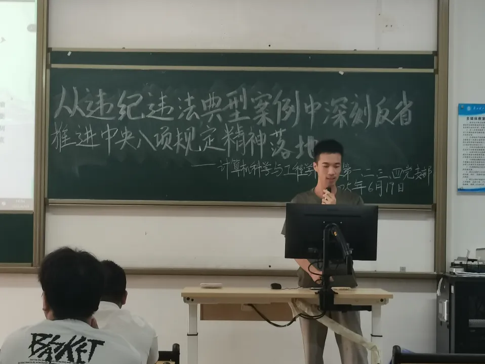 最后,韩志狄副书记对本次学习会进行总结。他提出三点要求:一是要持续强化理论学习,将党纪法规内化于心;二是要发挥先锋模范作用,带动身边同学共同营造风清气正的校园氛围;三是要积极参与支部“廉洁党日”“廉政微课”等活动,推动作风建设常态化、长效化。