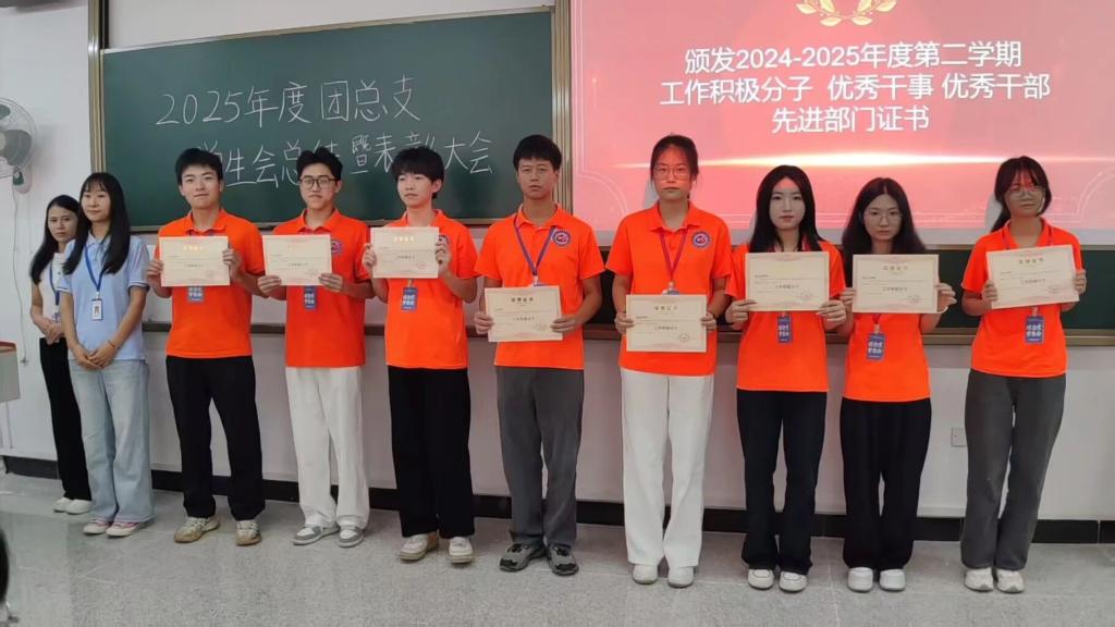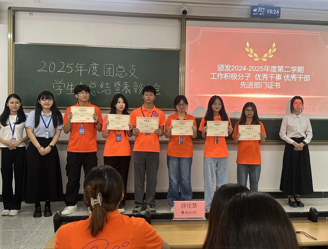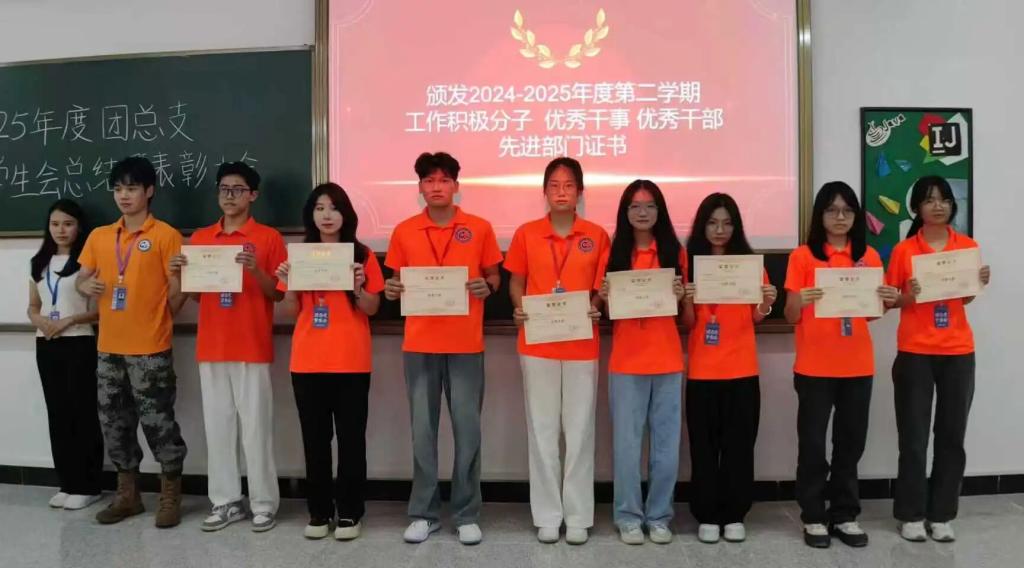 表彰环节,由薛佳慧老师以及冯军贤、李盈颖、马煜盛分别为2024-2025年度第二学期的工作积极分子、优秀干事、优秀干部和先进部门颁发荣誉证书;赖彬彬书记、邓梦铃老师分别为2024-2025年度工作积极分子、先进个人和先进部门颁发荣誉证书。