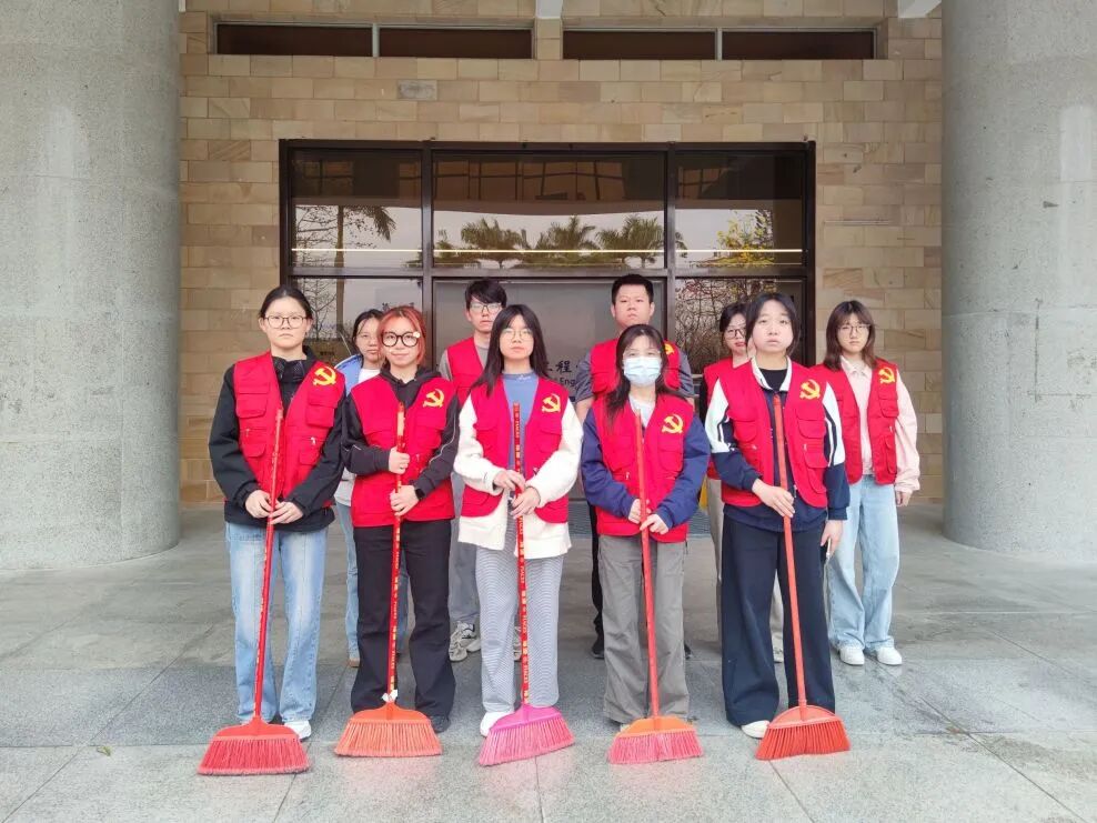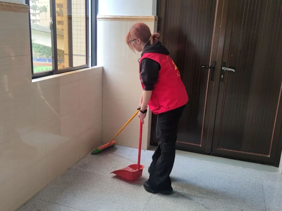 清扫过程中,志愿者们各司其职、互帮互助,有的清扫公共区域,有的清理角落碎屑,协作高效有序。大家弯腰俯身,认真劳作,每一个动作都彰显着青年学子的责任与奉献。
