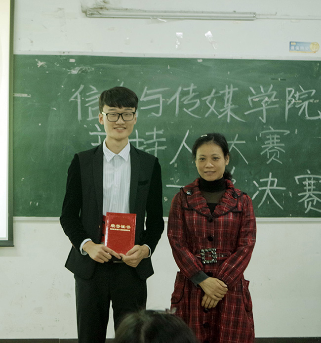 此次决赛分为两个环节:一是由选手两两配对进行模拟主持;二是个人比赛环节,先由选手进行个人模拟主持,随后观看随机抽取的视频并进行配音。选手们都表现得自信得体,应变自如,赢得了台下一阵阵掌声。接着,由评委冯彤彤为本次大赛点评及总结。她指出了主持时需要注意的地方并提出了一些小技巧,同时也祝愿选手们能做得越来越好。经过近两小时的比拼,最终马汶锐夺得桂冠,邓嘉祺、陈婷梅荣获二等奖,叶用文、李敏婷、李刚荣获三等奖。活动尾声,由杨柳书记等嘉宾为获奖者进行颁奖。最后,全体嘉宾,选手及工作人员上台合影留念。