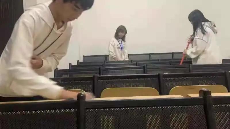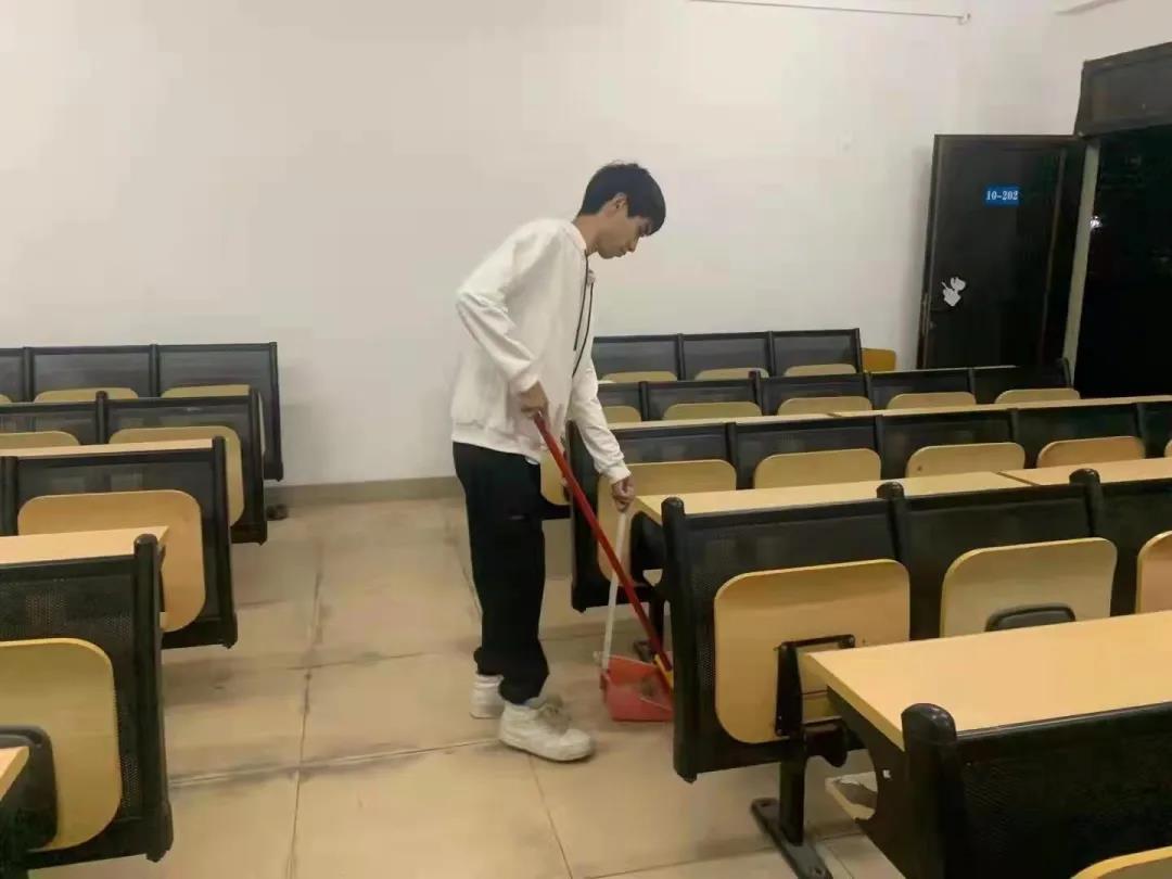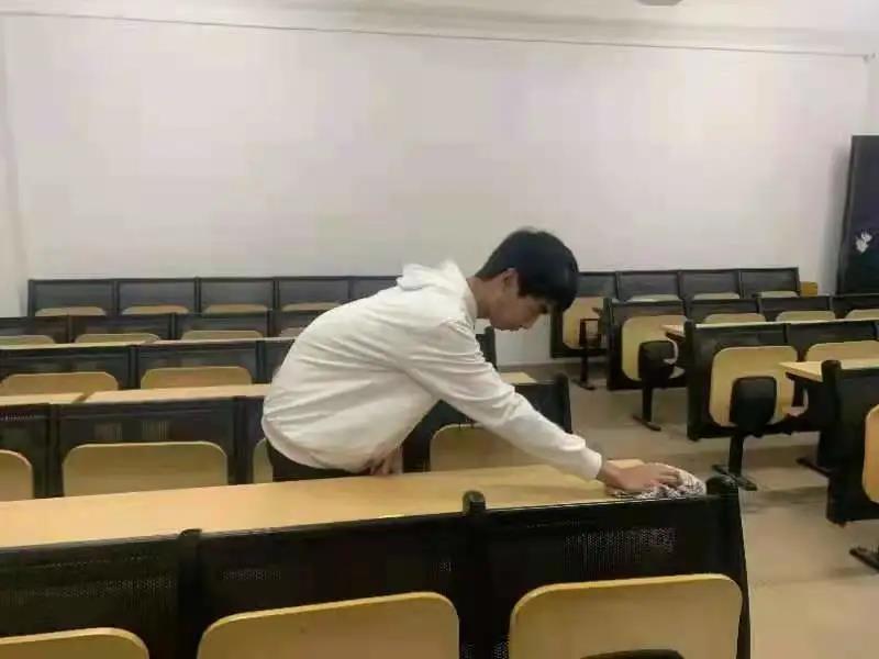活动开始,志愿者们拿起扫除工具,大家纷纷行动,热情高涨,对考研教室进行全面打扫。志愿者们分工明确,协同合作,不怕脏、不怕累,积极投身于劳动中。擦黑板,扫地、拖地,整理桌椅,对隐藏在死角的垃圾彻底清理,确保不留一丝脏物。经过大家的清理与打扫,整个教室焕然一新。