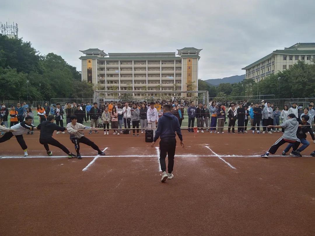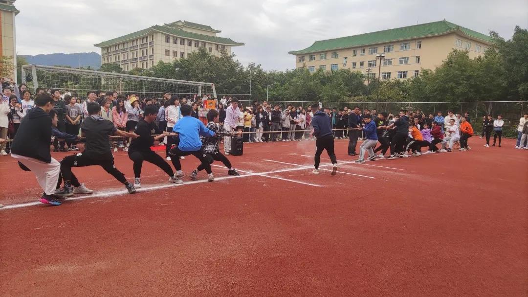 赛场上选手们团结一心,奋力拼搏,绳子中间的红标时而往左,时而往右;场下啦啦队紧握拳头,齐声助威,震耳欲聋。