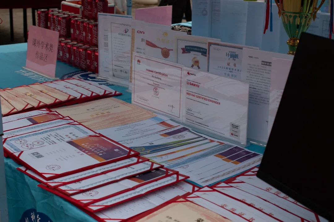 在本次科技节中,公司展示了众多科技成果与学术作品,如创业赛、专利等。展区内陈列了各类科技奖项及奖杯。