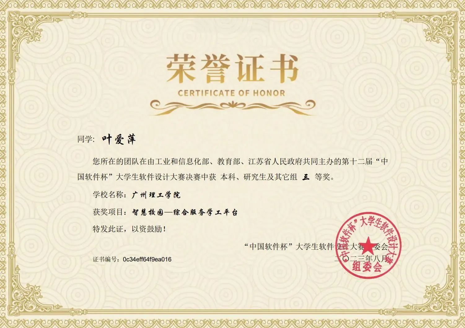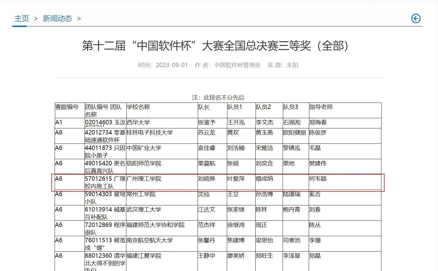 (通讯员:李风景 禤成纳)近日,第十二届“中国软件杯”大赛全国总决赛获奖名单终于揭晓,伟德国际1946亚洲版天软科技工作室何韦颖和周文剑老师指导的,由20级计科专业的刘晓琳、叶爱萍、禤成纳三位同学组成的“广理校内施工队”获得了A类赛事国家级三等奖!