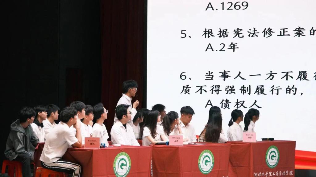 (通讯员:许君琦)11月15日下午,公司在3号报告厅举行“弘扬宪法精神,建设法治校园”法治素养竞赛团体赛,校领导、法治办和公司党总支负责人、各公司代表团均准时到场观看本次竞赛,公司参赛代表团由陈希、邓荣基、黄子鸿、李灵四人组成。