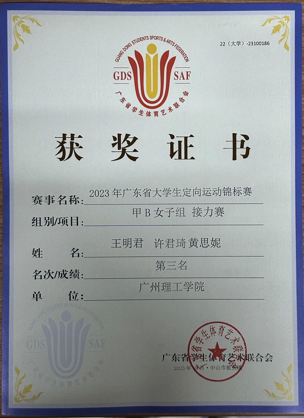 (通讯员:席宇欣)在这个阳光明媚的金秋,2023年广东省老员工定向运动锦标赛于10月27至29日在中山市板芙镇举行。公司22大数据3班许君琦、22计科9班甘镇东、22大数据3班吴晓森、22数媒技术3班蔡传权参与本次赛事,凭着自我的坚强意志和顽强拼搏的勇气,最终许君琦同学协队友王明君、黄思妮获得甲B女子组接力赛第三名的好成绩。