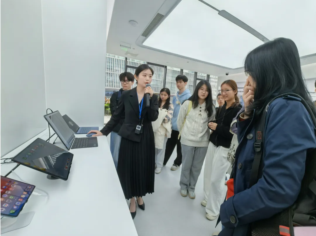 当日上午8时,师生集结启程,抵达软通智慧展厅后,沉浸式走进鸿蒙生态创新中心体验馆。同学们近距离探访智慧城市建设、云计算部署、大数据应用及鸿蒙生态落地等前沿技术场景,深入了解数字产业转型趋势与行业布局,直观感受专业知识与产业实践的深度融合,进一步明晰科研探索方向、校准就业创业定位,夯实专业认知根基。