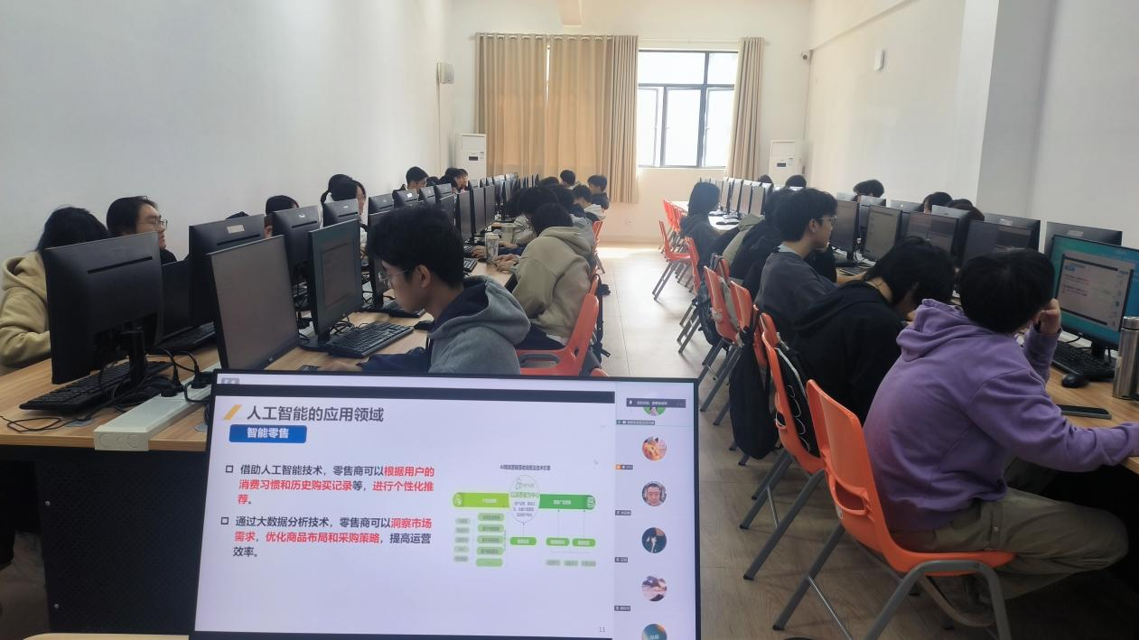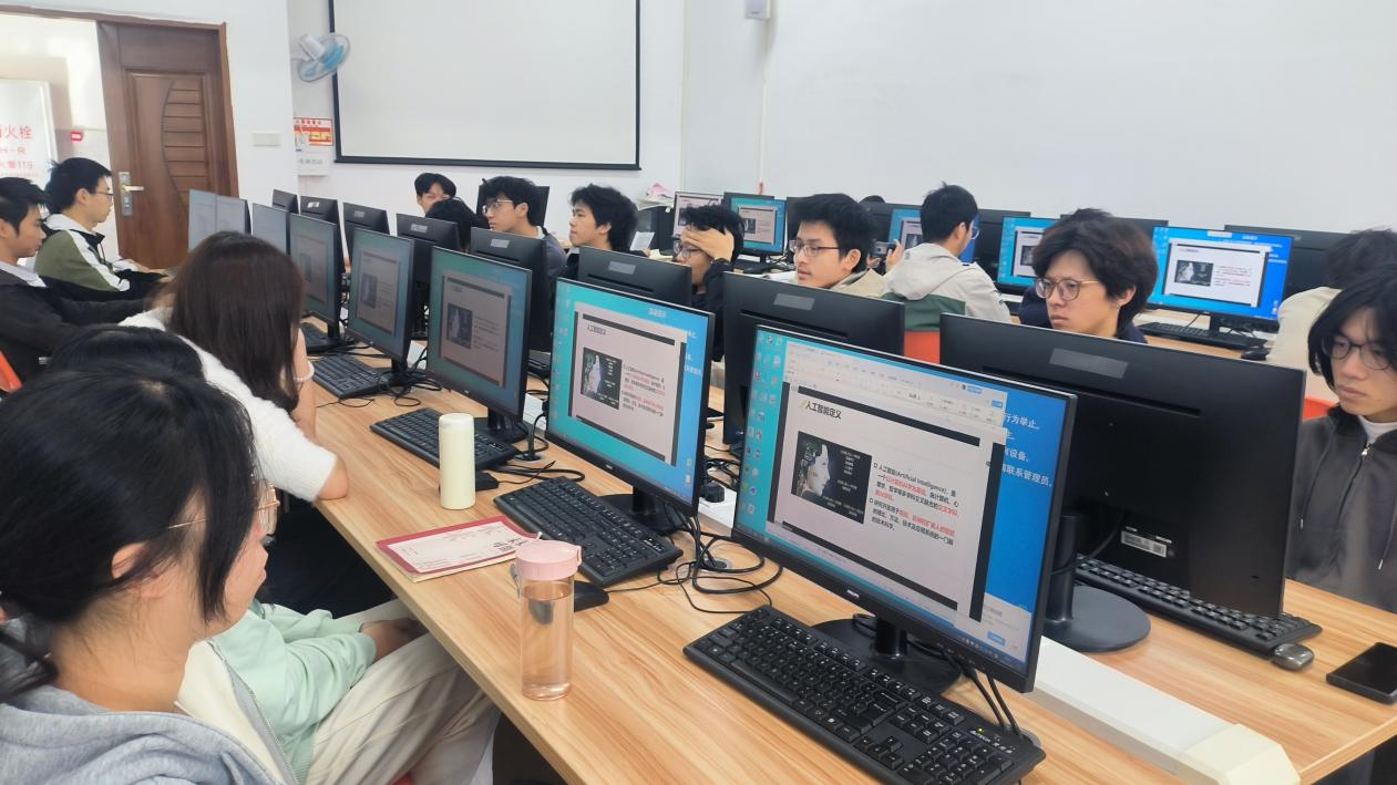 随后,广东财经大学张池军教授以线上授课形式,带来“人工智能技术与应用”主题学术讲座,新生延续“主会场+分班教室”线下参与模式。主会场内,学子紧盯屏幕紧跟讲解探索AI前沿;分班教室中,任课老师提前调试设备,通过腾讯会议共享桌面同步转播,全程关注听课状态,保障传输清晰流畅。