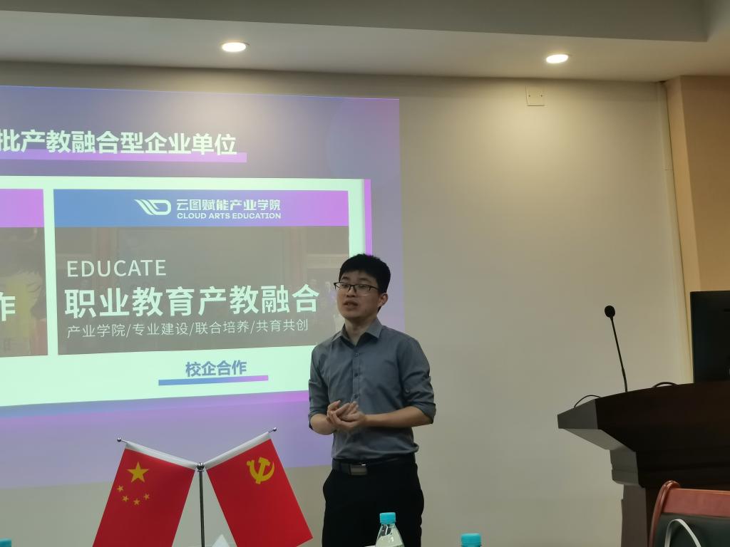 在交流会上,广州云图动漫设计有限公司肖寅爽总经理表示,为了促进数字技术人才的培养,更好地缩短产业人才培养周期,公司在教学与配套服务方面与多所公司展开校企深度合作。随后,委托校企主管陈昌伟向与会人员详细介绍校企合作项目。陈昌伟主管现场演示了云图动漫设计有限公司在游戏开发、影视动画制作、漫画创作等领域的开发成果和合作案例,并表示,公司已专门成立校企合作部门赋能高校产业公司建设,在真实项目融入实践性教学、学科竞赛支持和双师培养多个方面有丰富的实践经验,是广东省首批产教融合单位。