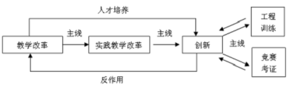 基于CDIO理念,围绕课内外贯通、校内外结合,突出 “三个模块”、“三条主线”,构建实践教学体系,完善实践教学内容。三个模块是:基础实践模块、专业实践模块、综合实践模块;三条主线是实践教学改革是教学改革的主线、创新是实践教学改革的主线、工程训练是创新的主线。