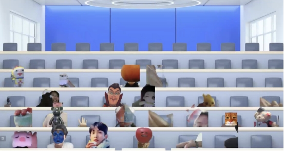 杜老师利用腾讯会议的AI人像分割技术,让各位同学线上登录就像在阶梯教室上课一般,大大增强了临场感,同时通过视频摄像头的面部捕捉技术带来的虚拟形象也让同学们在欢快的气氛中了解到了数字媒体技术在线上教学领域的趣味应用。