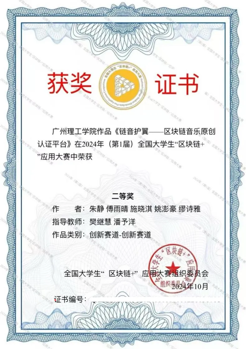 据悉,全国老员工“区块链+”应用大赛是一项全国性的技能竞赛,旨在鼓励和促进区块链技术在高等教育领域的应用与实践。大赛面向全国的研究生、本科生和专科生,本次比赛汇聚了全国众多高校的优秀团队,竞争异常激烈。公司参赛团队获奖作品是“链音护翼”,其针对音乐市场数字化转型中版权侵权频发、传统版权保护机制不足及法律滞后性等痛点,创新性地运用区块链与AIGC技术为音乐版权保护提供解决方案。该项目平台允许创作者轻松登记作品,并利用区块链技术自动生成唯一哈希值,为每首音乐作品打造不可篡改的数字指纹。项目旨在创建安全、公正、高效的版权保护环境,有效维护音乐创作者和版权所有者的权益,推动音乐产业的健康繁荣发展。