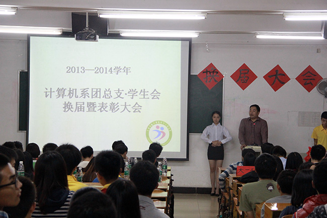 秋高气爽,丹桂飘香,2013年11月5日晚,广东技术师范公司天河公司计算机科学与技术系团总支•员工会,在4栋101教室隆重召开了2013-2014换届暨表彰大会。系党总支书记彭康煜书记,系办公室主任袁主任,团总支书记何祉谕书记,新老主席团成员们和各部门正、副部长们以及全体大一干事应邀参加此次大会。此外,此次大会还邀请了院级部门和八大系员工会的代表。