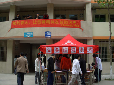 2011年3月23日在天河公司8栋员工宿舍楼下,计算机系举办的学习雷锋义务维修电脑活动在同学们的赞扬声中圆满结束。为了弘扬雷锋精神,为同学们服务,我系学习部组织了这次义务维修电脑活动。参加活动的同学发挥自己的专业特长,满腔热情地为前来咨询和送修电脑的同学服务。到下午五点活动结束,共帮同学们调修电脑10余台次,回答同学们电脑使用和维修等咨询20多人次。在整个活动中,同学们在帮助别人的同时,也收获了学习雷锋精神,助人为乐的快乐,检验了自己所学专业对就业前途的展望。在同学们的赞扬和欢乐歌声中,义务维修活动落下了帷幕。