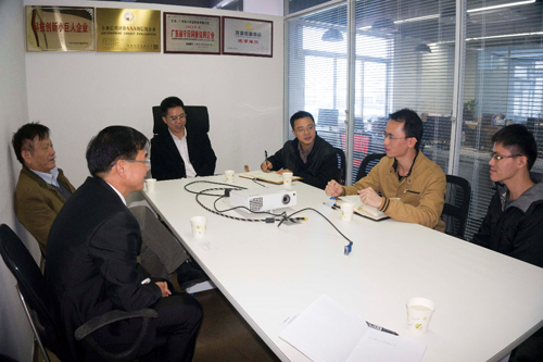 随后,考察组来到广州海川信息科技有限公司,公司2016届毕业生吴如彬、冯文坚两位同学在该公司工作。公司总经理柏俊热情接待了到访的公司老师并组织了座谈会。会上,袁书记首先说明了公司到访的目的及期望。柏经理说道,公司两位同学给了公司“惊喜”,技能基础扎实,自我管理良好,能够做项目、挑担子,希望自身多加强沟通能力。两位同学也感受到公司“和睦相处、真诚关怀”的氛围,对公司发展充满信心。同时,也希望公司在人才培养中能更好地联系社会实际,引入校外企业开展实践教学。申经理最后提出希望企业能将项目研发、开发等项目对接校园,实现校企人力资源和技术的合作。