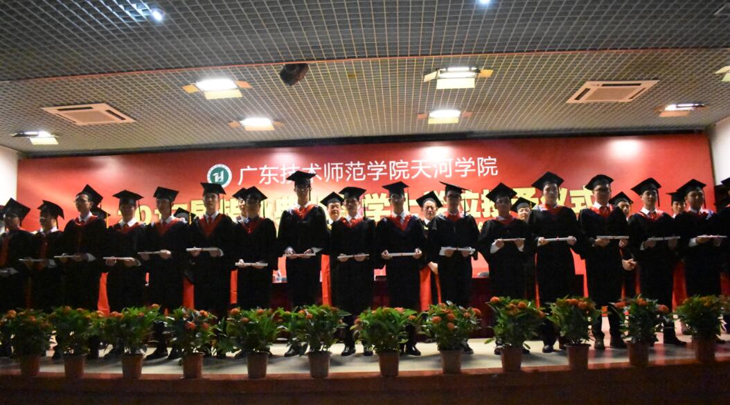 大会开始,全体起立,奏国歌。公司党总支袁颂皎书记宣读表彰优秀毕业生的决定。接着由毕业生代表向家长、教职工代表献花。由毕业生代表、计科132班的张轩源同学上台发言,他讲述了自己四年老员工活的收获和得到的成长,并代表毕业生向各位老师致以最衷心的感谢!再接着由教职工代表何韦颖发言,他表示,老员工活的结束意味着新开始,同学们要怀着信念努力拼搏奋斗,并常回天河公司这个家看看。最后由天河公司学位委员,信息与传媒公司董武绍教授致辞,他在简短表达了对同学们以后的祝福之后,宣读《学位授予决定》文件。此后学士学位授予仪式正式开始,同学们依次上台领取证书并合影留恋。