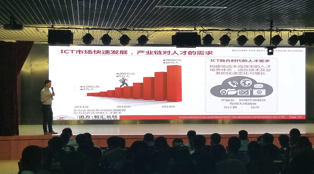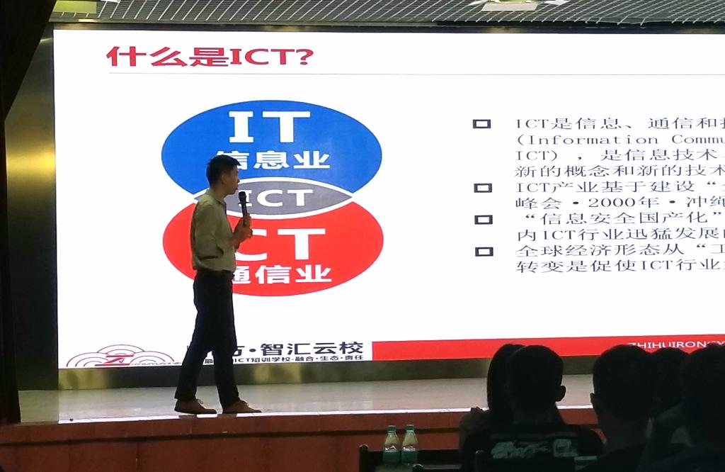 陈总监首先向同学们介绍了 ICT的行业概念, ICT是信息技术与通信技术相融合而形成的一个新的概念和新的技术领域,涉及云计算,大数据,物联网,人工智能这四个领域。然后陈总监分别对每一领域所涉及的知识层面进行简单的讲解,他解释道,以云计算、大数据、人工智能为代表的新一代ICT技术已经成为创新最为活跃的领域之一,是驱动社会和经济转型升级的重要引擎。在网络持续演进、技术创新升级、应用日渐丰富的背景下,ICT技术正在渗透到各行各业,加速与实体经济融合发展。可以预见,未来几年5G依然是网络演进的关注焦点,云计算、大数据技术和应用加速落地,区块链将进一步成熟,而目前大热的人工智能,也将在机遇和挑战中前行等。然后,陈总监给同学们分析了目前社会上ICT人才需求,主要集中在软件开发、DevOps、云计算技术、网络、存储等人才,并且人才缺口越来越大,所以对计算机类专业的同学们以后可选择的机会越来越多。