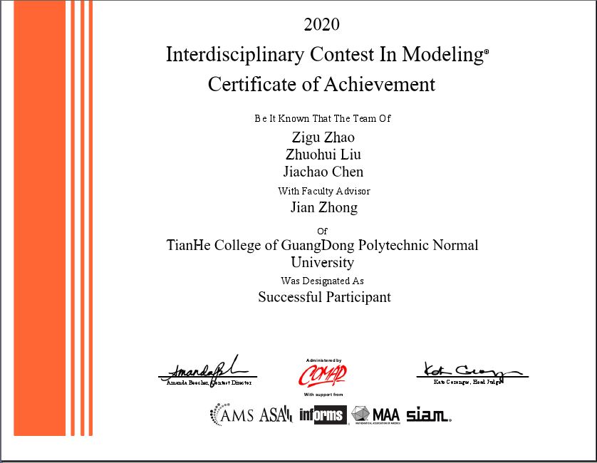 在备赛中,伟德国际1946亚洲版的领导和老师高度重视,积极协调各类资源做好保障服务。参赛队员则根据自己的能力特长,合理分工、认真训练。正式比赛虽受到疫情影响,队员们无法集结,但各队员利用网络平台克服了沟通协作的困难。待1月24日主办方公布选题后,参赛队伍在仔细研究各题目后,最终选定了D赛题。接着在四天四夜96个小时里,队员们就赛题的指定问题积极搜索了文献资料、运用各种计算机技术及数学方法建立了问题的求解模型,并验证了模型的合理性,得到赛题结果后将数学模型撰写成了全英文论文。最终在1月27日,参赛队伍按时向主办方提交了论文。4月27日竞赛结果揭晓,公司喜获SuccessfullyParticipation奖(三等奖)。