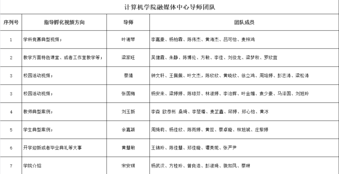 (二) 融媒体中心视频号导师团:叶谢琴、梁家旺、蔡靖、张国梅、刘玉新、余嘉颖、黄慧敏、宋安琪。主要负责融媒体中心视频项目的孵化,并对各团队成员进行专业化培训。
