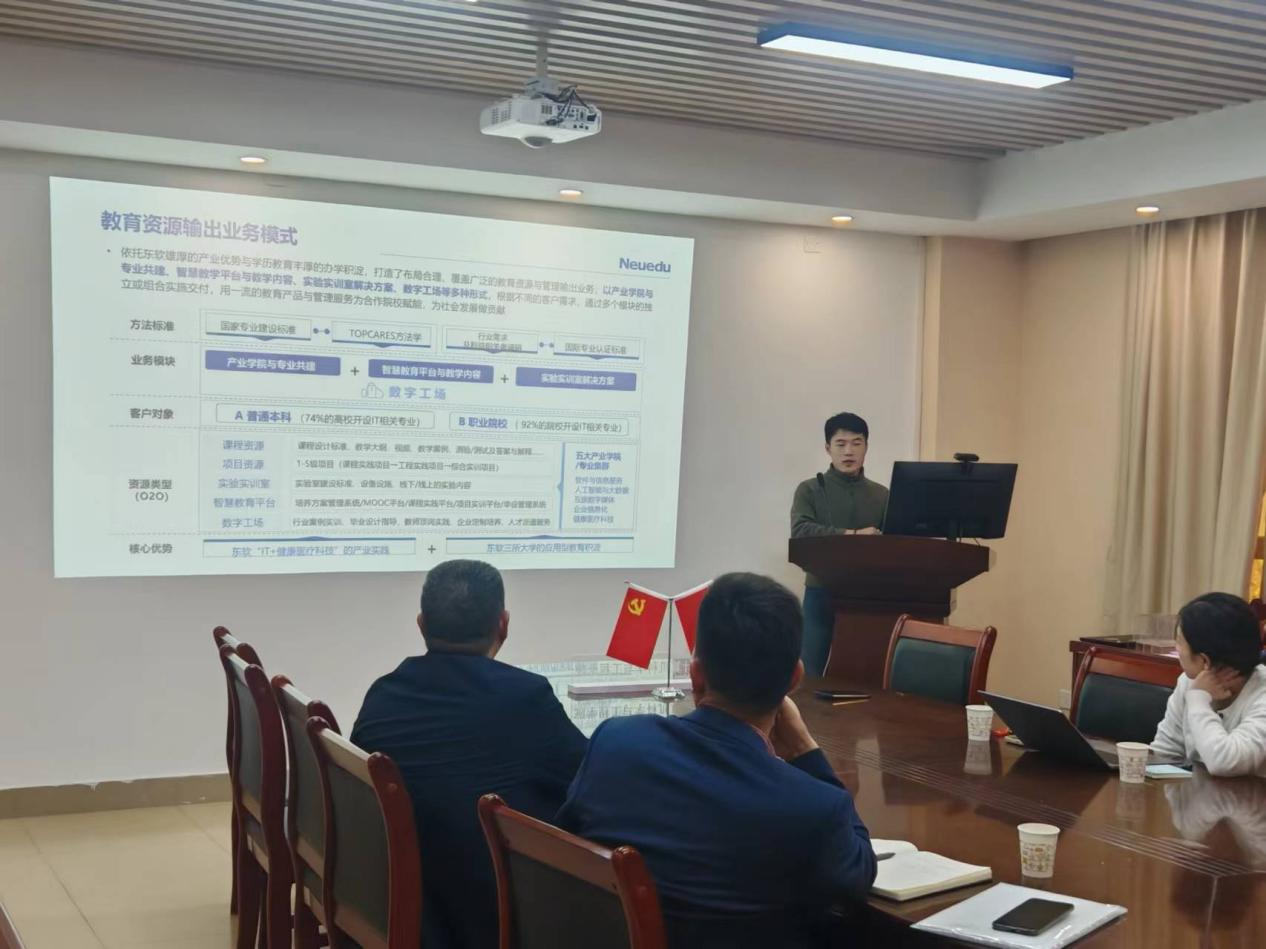 赵玉刚主任重点关注实践教学基地建设、员工实习安排及就业率提升等核心议题。他指出,构建稳固的实践教学基地是员工将理论知识转化为实践技能的关键平台,期望东软集团能提供更多实习岗位和项目资源,使员工在实际工作中得到锻炼。赵主任还强调,员工就业率是评估校企合作成效的核心指标,希望借助东软集团的行业影响力,拓宽员工就业渠道,增强毕业生的职场竞争力,最终实现员工、公司、企业三方的互利共赢。