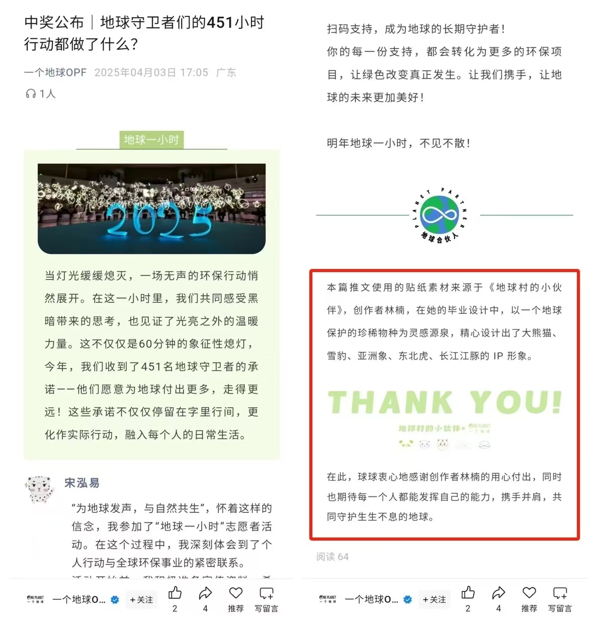 4月3日,“一个地球OPF”官方公众号特别发布推文,选用林楠同学设计的IP形象图案,对其作品给予了高度评价。这不仅是对林楠个人努力的肯定,也标志着创意设计在濒危动物保护领域的重要价值得到进一步认可。