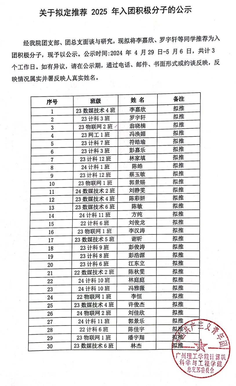 经公司团支部、团总支面谈与研究,现拟将李嘉欣、罗宇轩等同学推荐为入团积极分子,现予以公示。