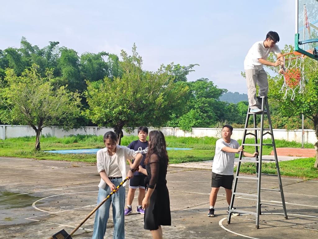 抵达校园后,队员们发现乡村篮球场因长期缺乏维护,存在篮球架松动、地面落叶堆积、篮网破损等问题。为消除安全隐患,大家迅速分组行动:有的用工具加固球架底座,有的手持扫帚清扫满地落叶,有的爬上球架更换标准篮网。经过两小时的忙碌,原本略显陈旧的球场焕然一新,整洁安全的环境为后续教学筑牢了基础。