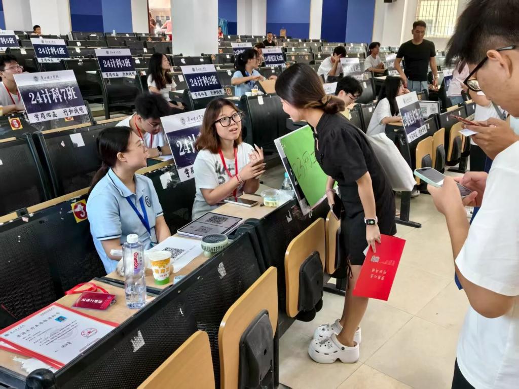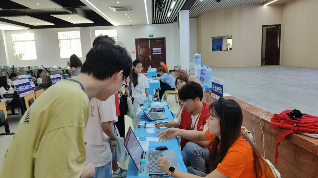 校园报道处,公司领导、老师、员工会成员以及志愿者们分工明确,负责核对新生信息的团学成员,高效办理注册手续;手持校园地图的志愿者,耐心解答 “超市在哪”“宿舍怎么走” 等问题;部分志愿者主动帮新生搬运行李,以饱满的热情和亲切的笑容迎接每一位新生的到来。