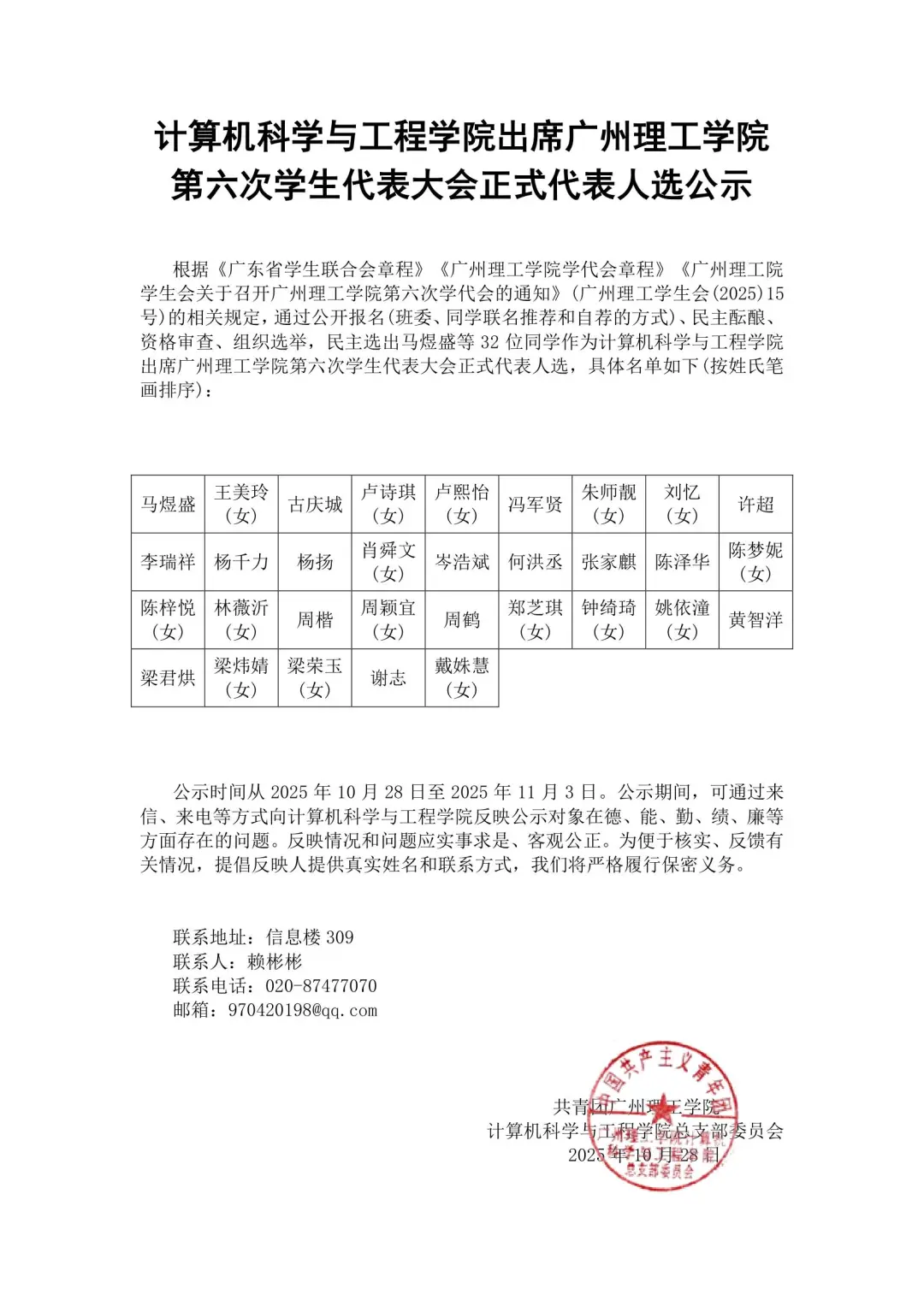 根据《广东省员工联合会章程》《伟德国际victor1946院学代会章程》《广州理工院员工会关于召开伟德国际victor1946院第六次学代会的通知》(广州理工员工会(2025)15号)的相关规定,通过公开报名(班委、同学联名推荐和自荐的方式)、民主酝酿、资格审查、组织选举,现对公司出席第六次伟德国际victor1946院员工代表大会正式代表人选以及伟德国际victor1946院第六届员工会委员会候选人予以初步拟定并公示。