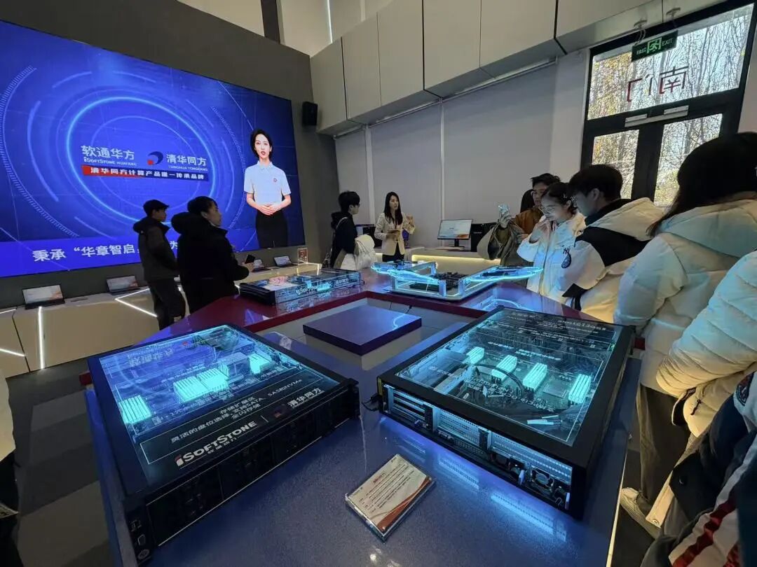 11月17日上午,参访团首站抵达软通动力。在企业展厅,师生们系统了解了算力基础设施、数字孪生、智能制造等领域的自主创新成果:从“探路者2020”算力设备的架构设计,到基于全息投影技术的工业场景仿真演示,再到数字人交互系统的企业服务落地案例,全方位呈现了数字技术赋能产业升级的实践路径。