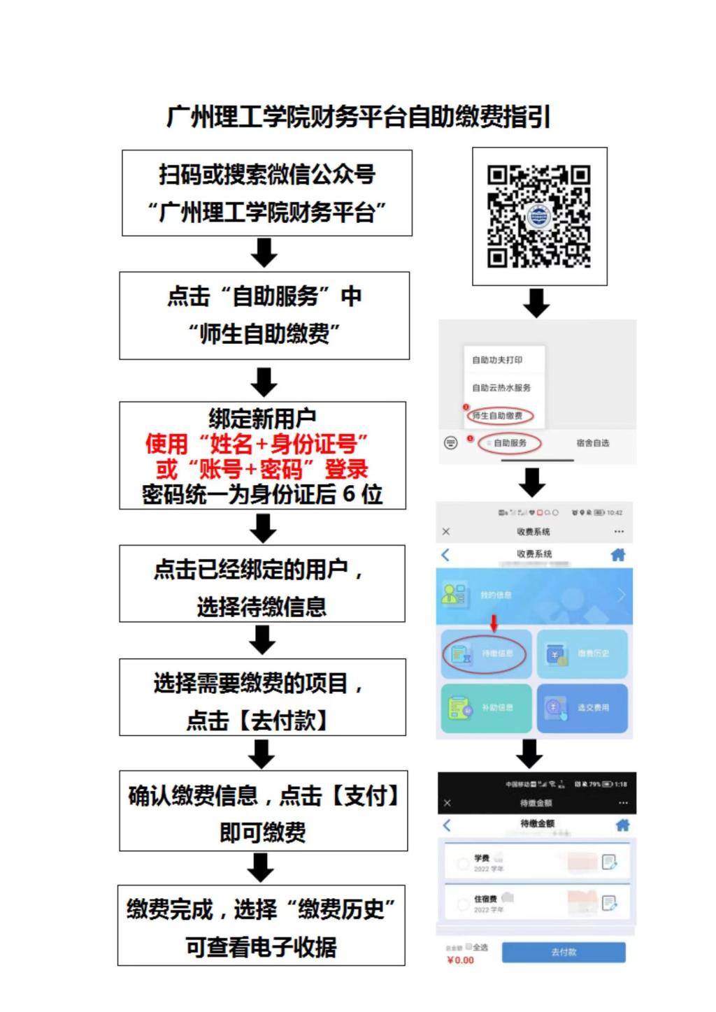 绑定登陆账号后在“待缴信息”中查询待缴项目及金额,勾选缴纳项目、点击付款,即可缴费。缴费成功后可在“缴费历史”中查询到对应的电子收据。